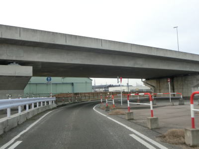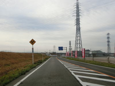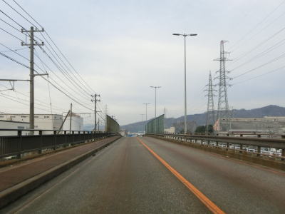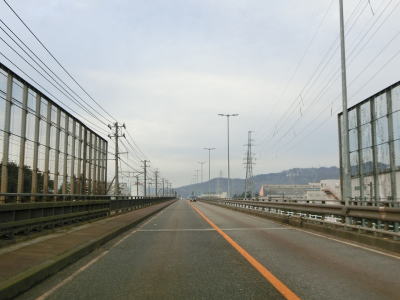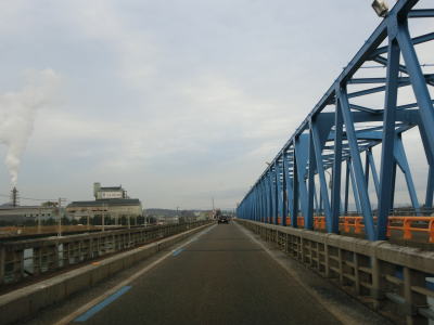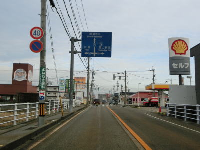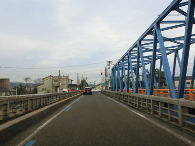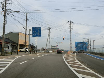 | 万葉線と並走しながら旧新湊市の中心部を走っていると緩やかな上り勾配の右カーブを走っていると富山r35庄川本町交差点を通過して新庄川橋を渡る。西向き車線は桁橋で東向き車線がトラス橋となっており、架橋された時期が異なるのだろうがどちらも新庄川橋となっている。 | ||