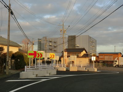 | 河間交差点から約200m走ると河間1号橋の直後を左にカーブして市道(河間27号線)との交差点を左折する。交差点の西にはコンクリートブロックが置かれており、元々直進だった事が窺える。接続している河間27号線は元々存在していなかった道路で、河間交差点の改良工事に並行して整備されたものと推測される。中野西之川1号線と河間27号線とその間の河間中野3号線(の一部)を通れば河間交差点から交差点をひとつ曲がらなければならないとは言えスムースに行き来できる事からいずれ国道と市道の入れ替えが行われるのかもしれない。 市道との交差点からも歩道のない対面2車線道路が続いており、程なくして養老鉄道の北大垣踏切を通過する。さらに進んで緩やかな短い勾配を上って岐阜r216池尻町交差点を通過してR475/C3東海環状道の西濃池尻高架橋をくぐる。池尻町交差点で交差している道路は両方向とも片側2車線だが、県道に指定されているのは関ケ原方面のみで、神戸方面は市道である。 |
