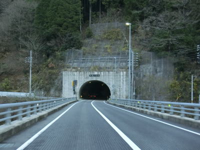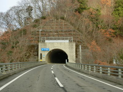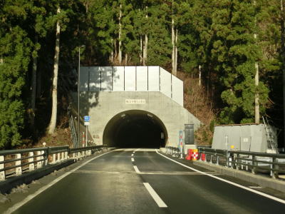 | その後は村平コト谷橋とシッペ由定橋という短い橋を渡る。村平コト谷橋の村平は櫨原集落の中心だった村平という地を、コト谷は橋が架かっている谷を指している。シッペ由定橋は橋が架かっているシッペ谷とそれにまつわる由定伝説に因んでいる。 冠山峠道路が開通するまでは最奥のトンネルだった塚白椿隧道をくぐる。その名称は塚という地名と“宮山の白椿”という民話に因んでいる。このトンネルの全長は3330mと徳山バイパスの中では最も長い。 |