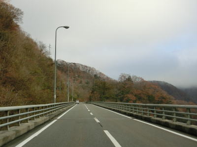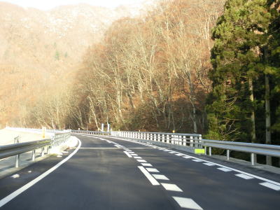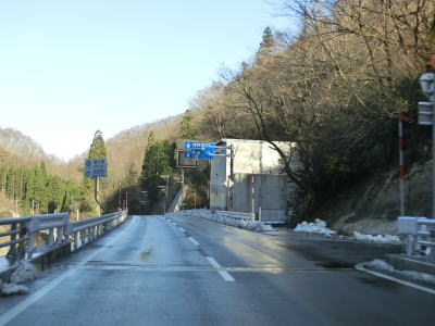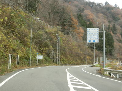 | 藤橋城への北川の出入口に当たる町道との交差点を過ぎると徳山ダムまでの案内標識が設置されているが、これもいずれ“福井”の文字が追加されるかもしれない。緩やかに左にカーブして内部でS字状のカーブを描く池太沢夜叉隧道をくぐり、藤橋川太郎橋、花房猿巻橋、花房ビッキ橋を渡ってやや急な左カーブの先で雷倉大岩魚橋を渡る。池太沢夜叉隧道以北のトンネルと橋梁の名称は曰くありげな長いものが多いのが特徴である。名称の由来や元になった伝承等が記されたプレートが各トンネル・橋梁に設置されているが、文字が小さく走行中に読む事はできない。かと言って停車できる場所もほとんどなく歩道もないためじっくり読める環境ではない。池太沢夜叉隧道は池太沢の大蛇伝説に、藤橋川太郎橋は川太郎=河童に因んでいる。花房は揖斐川対岸の山の名前で、猿巻き場は地名、ビッキは民話に登場する蛙を指している。雷倉も山の名前で、大岩魚は民話に登場する魚を指している。 | ||