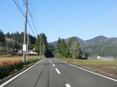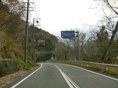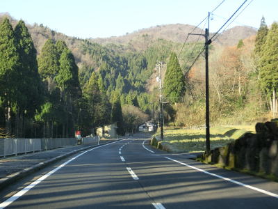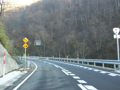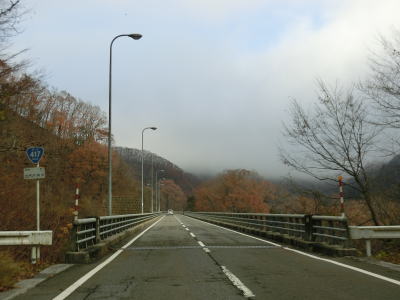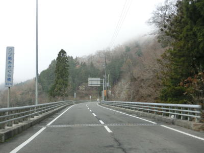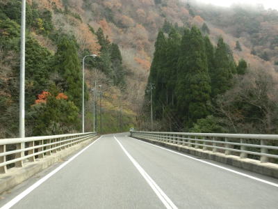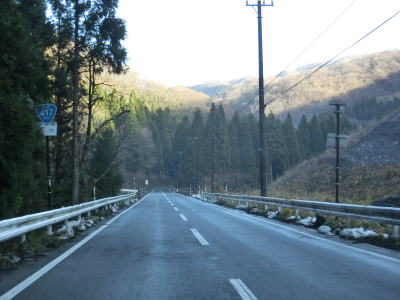 | 蛇行する揖斐川に沿った2車線道路を淡々と走る。周辺に集落のない場所ながらセンターライン付きの2車線道路と比較的整備されているが、支流の親谷に架かる親谷橋は1.5車線幅であり、大型車の離合は不可能である。冠山峠が分断されていた頃はこの幅でも問題なかったかもしれないが、冠山峠道路が開通した今となっては大型車が増える事が予想されるためボトルネックになるかもしれない。 | ||