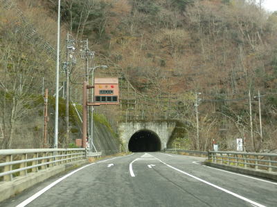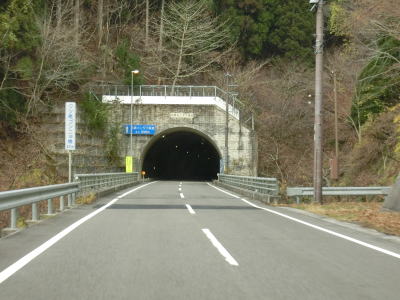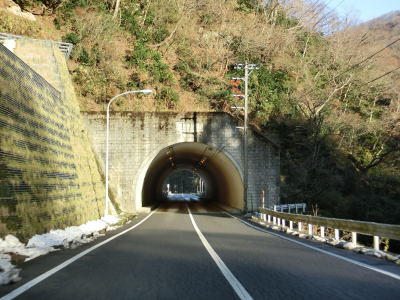 | クツ尾ゴンニョ橋という短い橋を渡って本郷カンタク隧道に入る。ゴンニョという珍妙な名称は、当地(本郷)から能郷白山に至る参道(山道)を指している。本郷カンタク隧道は全長1630mと比較的長大なトンネルで、本郷に伝わる増徳寺の“かんたく和尚”に因んでいる。ちなみに本郷は徳山村の中心部だった集落である。 本郷カンタク隧道を出て右カーブを描いている漆谷上原橋を渡ってからカンノセ合掌隧道をくぐる。漆谷は橋が架かっている谷を指しており“しったに”と読む。上原は揖斐川の対岸の地名であり“あんぎゃら”と読む。揖斐川にあるカンノセ岩という大岩があり、行き交う人が岩に向かって合掌した逸話に因んでいる。 |