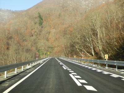 | 冠山林道との交差点の直後に品谷橋を渡って塚宮ケ原トンネルをくぐる。勾配は5.6%とやや急ではあるが開通したばかりのバイパス道路とあって走りにくさはほとんど感じない。シタ谷1号橋から5号橋が架けられているが、どれもシタ谷に架かっている訳ではない。 | ||