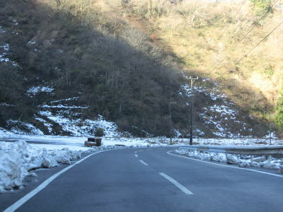 | 月ケ瀬集落を通り抜けて常安橋を渡ると常安集落に差し掛かるが、家屋が建ち並ぶ中を通っており乗用車はともかく大型トラックであれば狭苦しさを感じるかもしれない。家屋のない場所であっても車線幅に余裕はない。 | ||