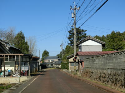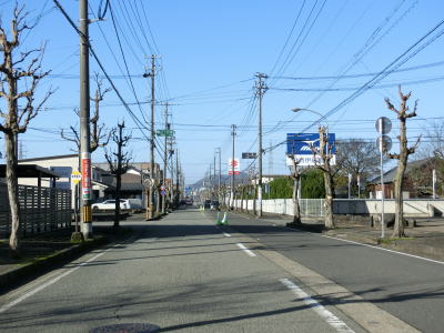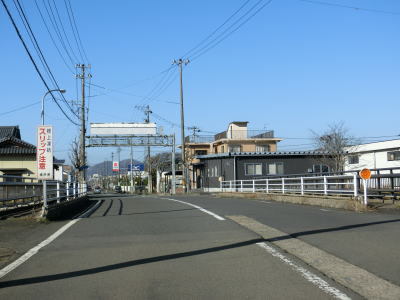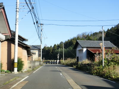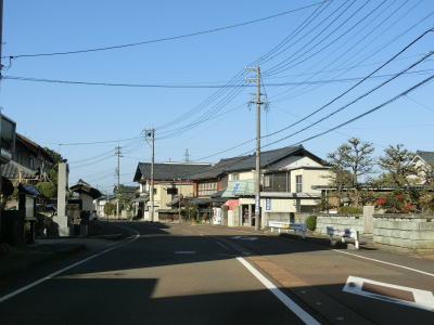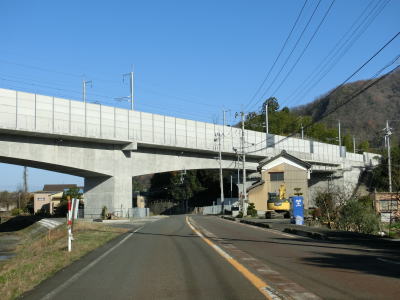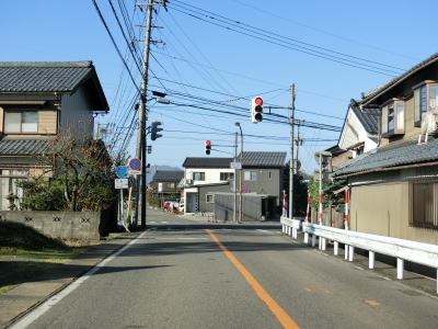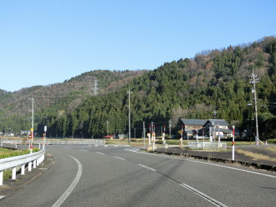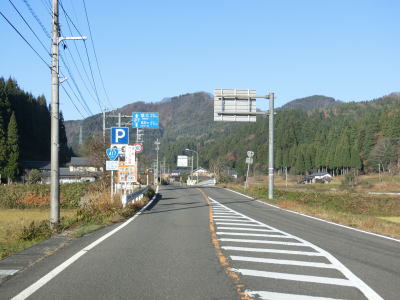| 融雪のための地下水に含まれる鉄分で赤茶けた路面の1.5〜2車線道路を走っていると鯖江市に入り、左カーブの先で北陸新幹線の高架をくぐる。前述のとおり、北陸新幹線は2024年3月16日に開業が予定されており、通行した時点(2023年12月9日)は開業前である。鯖江市に入ってからは集落内の2車線道路となるが、相変わらず車線幅に余裕がない。 | ||