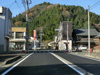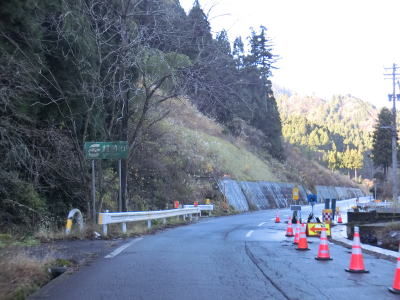 | 板垣坂バイパスの接続予定地点では片側交互通行規制が敷かれており、現道の一部を改良してバイパスに繋がるような感じであった。工事箇所を通過中に越前市の境標識が設置されているが、前述のとおり市町境は板垣トンネルである。 南坂下町集落の東端で信号機のない交差点を通過するが、右折方向の道路は現道であり、2023年12月の時点ではウォっちずで現役扱いされている。案内標識もなく通常は直進してバイパスを走る事になる。現道は集落内を通り抜けている2車線道路で特に面白味のある区間ではないためバイパスを走行している。 |