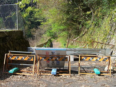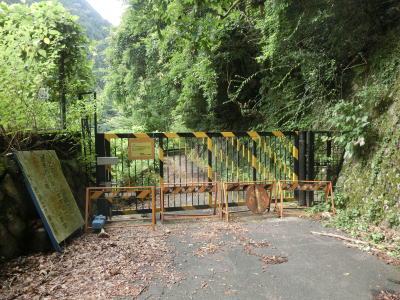 | 笠置ダム側のゲートに到着する。2007年頃はガードレールとA型バリケードで塞がれていたが、トラ模様の本格的なゲートに変わっていた。温見峠の能郷、黒津ゲートと同様に支柱の脇からの通り抜けも逃さない仕様である。車両用とは別に人が通れる幅だけ開くようにもなっており、何かの保守や調査のための出入りがあるのかもしれない。ゲート及び施錠等を破損した場合は、法律に基づき処罰されるという旨の警告が貼られている。 ゲートの隙間から奥の道路を撮影したが、10年以上通行止が続いている割にアスファルトの見える割合が多いという印象を受ける。普通の旧廃道で10年も車や人が通らなければほとんど自然に還った状態になってもおかしくない。 |