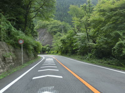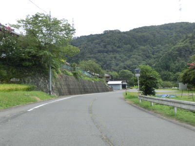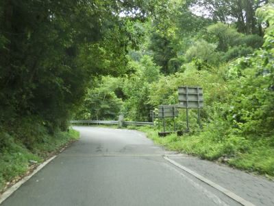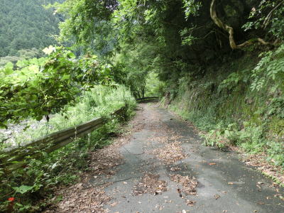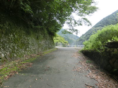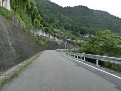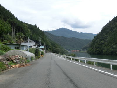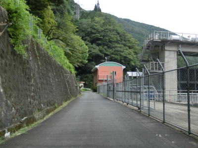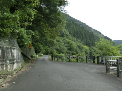 | 管理棟を過ぎた所で左側に車数台分のスペースがありそこから山に登る道路が交差しているが、その道路沿いの斜面に数軒の家屋がある模様。その後すぐに川寄りの駐車スペースのような場所を通り過ぎると道幅は完全な1.0車線幅と狭くなる。ダム湖の湖面がすぐ近くにあり、転落した場合は即死よりも溺死の可能性の方が高い。奥にダムや集落があるとは言え行止り区間のため交通量はきわめて少ないが、万が一対向車が現れた場合は離合に苦労する事は必至である。待避所なんてものは設置されておらず、路肩にタイヤを乗せて無理やり離合しなければならないが、川寄りは路肩が軟弱そうで怖い。 | ||