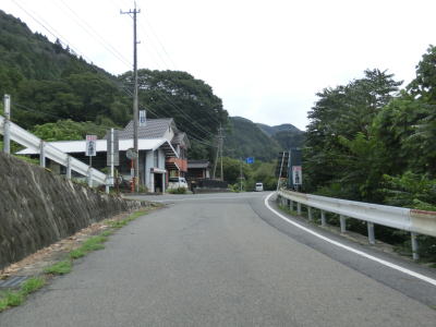 | 栃久保集落が終わると道幅が狭くなるものの笠置ダム〜栃久保集落間ほど狭くなく、1.5〜1.8車線程度である。左の山側の法面が整備されたものになるが、その上を岐阜r412が走っており、下ってきたr412との交差点に至る。直進方向がR418なのだが、路側帯の線がr412潮見方面に引かれており、笠置ダム方面は国道と言えども行止り区間のため、優先道路扱いされていない。そのためR418笠置ダム方面が割り込むような形なので、一旦停止義務はないもののそれに近い対応で交差点に進入しなければ危険である。 | ||