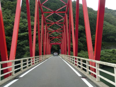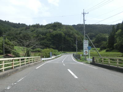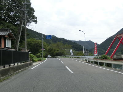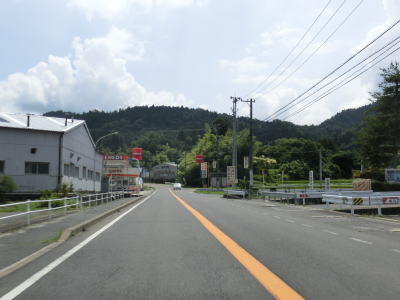 | 笠置ダムゲートから約2.0kmで突然道幅が広くなり消えかけのセンターラインの2車線道路となる。山の斜面には家屋が建っており栃久保という集落を通過する。集会所付近だけセンターラインがないものの1.5車線程度で交通量がほとんどないのでさほど走りにくさを感じない。木曽川に沿っているという状態は変わらず、前方に赤色に武並橋が見えてくる。この武並橋はR418の橋である。 | ||