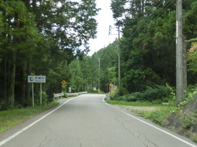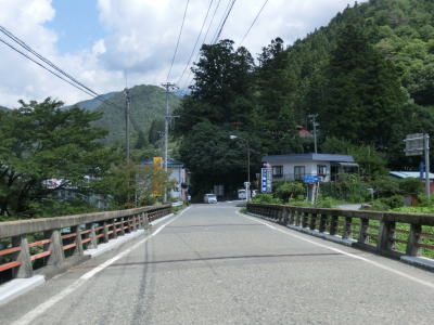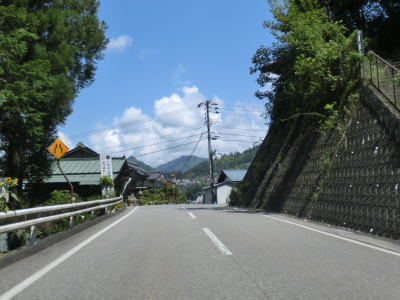 | 広狭が混在した道路を走っていると所蛇川を左のヘアピンカーブで通過して、その先で天龍村の中心部を構成する平岡集落に入る。集落に入る直前は2車線だったものの集落に入ってからは小刻みにカーブしている1.0〜1.5車線の狭路となる。村の中心部ではあるものの交通量は少ない。 | ||