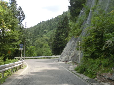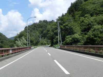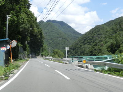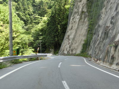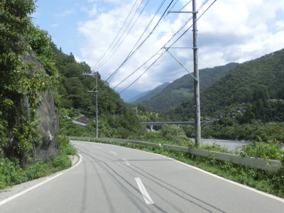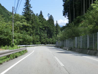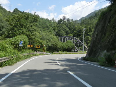 | 瀬戸沢橋を渡って早木戸川の右岸に移ってからも道路状況に変化はない。法面の落石防止対策がされている所を中心に2車線道路になっている箇所もあるが、基本的には1.5車線幅の狭路が続いている。交通量は少ないが、奥に天龍村の中心部があるため対向車が現れないとも限らない。 | ||