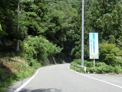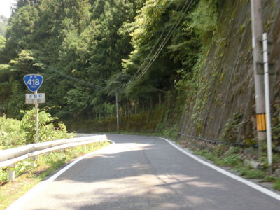 | おきよめの湯の第3駐車場を過ぎた所でセンターラインがなくなり1.5車線幅と狭くなる。その傍らにR418の改良整備促進を促す看板が立てられている。狭路になってからは引き続き早木戸川沿いを走っており勾配は非常に緩やかなものの見通しの悪いカーブが多く走行には気を遣わなければならない。ガードレールもカーブミラーも多数設置されており、山岳部を走る温見峠区間とは同じ酷道ながらその様子は異なる。 | ||
