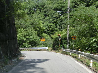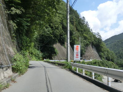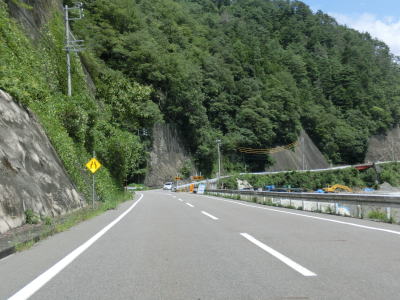 | 幅員減少の標識のとおり道幅は1.5車線と狭くなるが、現在の道路の下で拡幅工事が行われている。改良されて2車線となっている区間において法面の中ほどに電柱が立っており、その上部はだけ落石防止ネットがある事から現道の下に新たな道路が造られたと考えられる。よって走行時に工事していた区間もいずれ法面の一部と化して通行できなくなると考えられる。それを示すかのように勾配を下った先で工事現場の出入口を通過してからセンターラインが復活する。 | ||