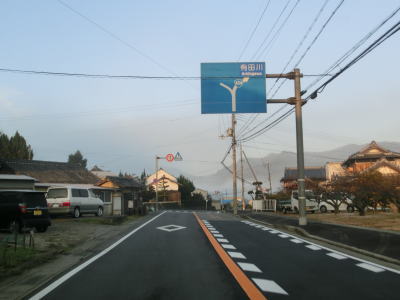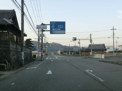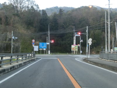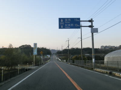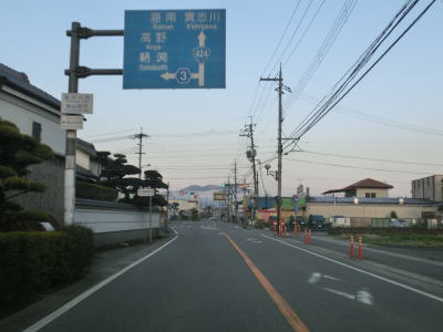 | 紀の川市の市役所の南東に位置するR24・和歌山r62鳥子川橋東詰交差点がR424の終点で、ここから田辺市の起点に向かって走る。早朝という時間帯のせいもあってR24の交通量は少なく、R424のそれはさらに少ない。約300m走ると和歌山r14打田交差点を通過するが、これはR24の旧道である。打田交差点からも直線道路が続いており、周辺は田畑が多いため見通しは非常に良い。 | ||