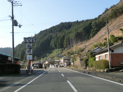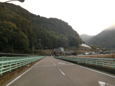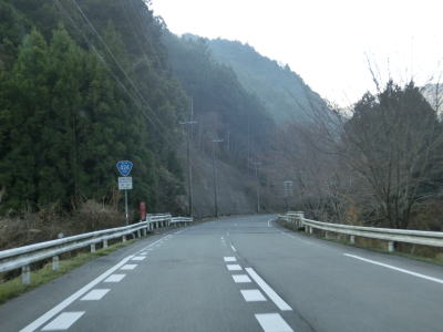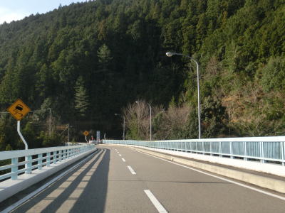 | 阿田木集落に差し掛かると谷筋を脱して空が開ける。左の急カーブを曲がった直後に和歌山r26・r194美山郵便局前交差点を通過して美山大橋を渡る。橋を渡り終えると同時に右に直角にカーブして日高川の左岸を走る。比較的大きな川に沿っているが、意外にアップダウンがある。とは言うものの交通量が少なく快走路と言える。上越方集落を通り過ぎると日高川から離れるが、すぐに今度は左側に川が現れる。これも日高川であり、蛇行してりるためこのような事になる。 | ||