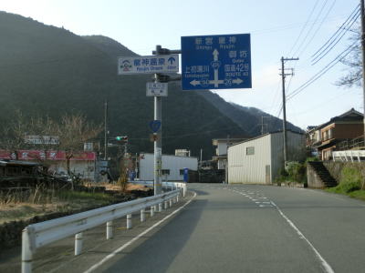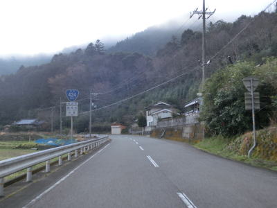 | 菅集落では川と反対の右側に国道と平行に架けられた橋が見えるが、集落内を通っている道路に繋がっている事からおそらく旧道と思われる。その後は日高川に沿って左に180度カーブした後にR425小家交差点を通過する。案内標識に表記されてないが、R425との重複区間が始まる。 | ||