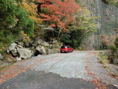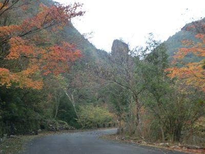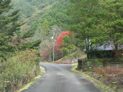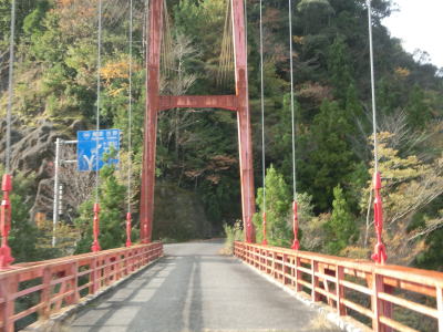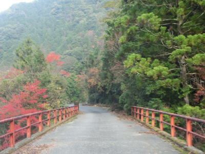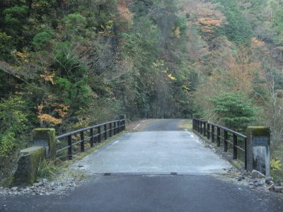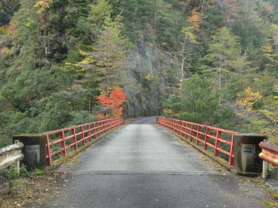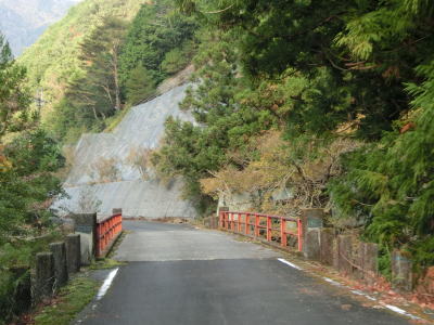 | かくれ滝を過ぎると道幅が1.8〜2.0車線幅と若干広くなるが相変わらずカーブが多く走りやすい道路状況とは言い難い。交通量は極めて少なく対向車に遭遇する可能性は低いが全くないとは言い切れないため慎重な運転にならざるを得ない。赤い欄干の名古瀬橋を渡ると古川の右岸に移る。 | ||