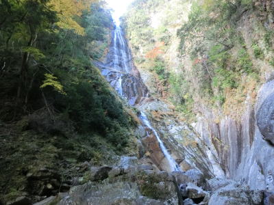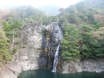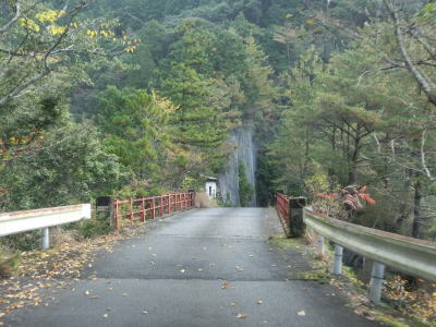 | 岩屋谷に架かる不動橋を渡るが、貯水池の反対側に橋の名称の由来となったと思われる不動滝が見える。落差は50m弱とかくれ滝の半分程度だが、それでも充分な迫力である。さらに上流に銚子滝があるが、地形の関係で不動橋上からは見えず少し下がった所から見える。不動橋を渡り終えた坂本貯水池に沿って走ると右カーブを曲がって古川取水口を通過する。ここで取水された水が送水管を通って尾鷲第一発電所で利用されている。 | ||