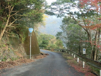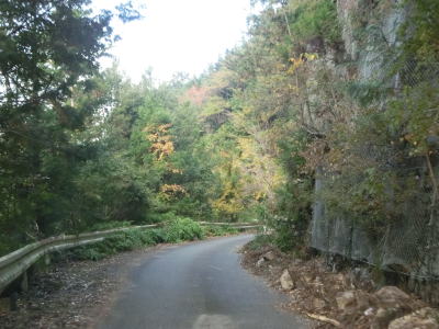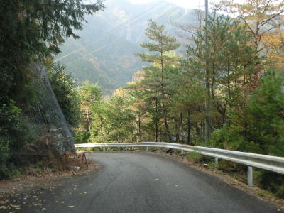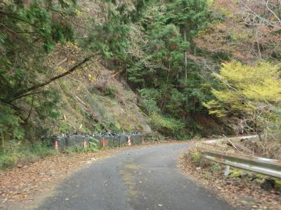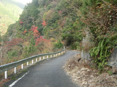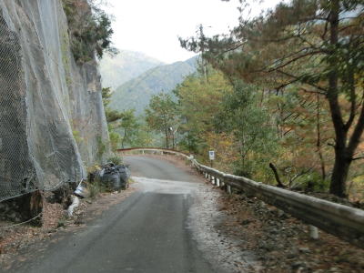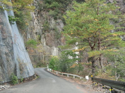 | 坂本ダムを過ぎても道路状況は良くならず1.5〜1.8車線幅のカーブの多い狭路が続く。ダム以東よりも切り立った地形が目立ち、まだ新しい法面補修箇所も見られた。おそらく通行止規制で施工が行われたと推測される。 | ||