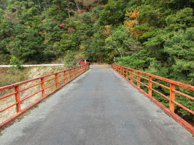 | 備後橋の南詰で備後川林道との交差点を道なりに右方向へ進む。左折の備後川林道を走ると終点からは塔谷林道が接続しており、最終的にR42の大又トンネルの西まで道路が続いている。ただし、塔谷林道はゲートで閉鎖されており、一般車両は通行できない。備後橋からもほとんど勾配のない狭路を走る。切り立った断崖ではないせいか落石も少なく路面も安定している。 | ||