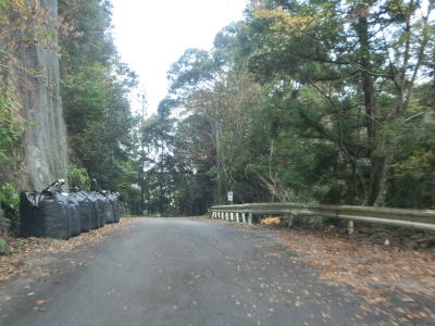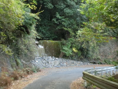 | 名護瀬橋を渡った直後から山側に土砂が堆積している状態になる。法面から崩れてきた土砂に見えるが、溝が奇麗なので長年の堆積物を浚えたものを路上に置いているのだろう。仮置きとは思われるがその距離が長く、ただでさえ離合困難な道幅がさらに狭くなり、離合不可能になっている。堆積物がなくなって一安心した所でナゴセ集落を通る。定住者はないが廃村ではないようである。ナゴセ集落を過ぎると堆積物が再び置かれており走りにくくなる。 | ||