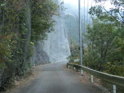| 瀧トンネルを出た先にコンクリート舗装の場所があるが、その西側の滝谷にはかくれ滝という名の滝がある。落差は105mとかなりの高さだが、少し奥まっているため国道からはほとんど見えず、それが名称の由来と思われる。サイクリングルートとしての案内があるだけ(しかもなぜか尾鷲方面に向かっている人しか見えない)なので、事前に情報がなければ素通りしてしまうかもしれない。No.53の車の後方に遊歩道のようなものが見えるが、単管パイプと木材を組み合わせただけで足場となる木材も平坦どころか隙間が多く、そこを通過しても大きな岩を渡る必要があるためバリアフリーとは無縁である。車いすはもちろん足が悪い方も通行するのは控えた方が良さそうである。 | ||