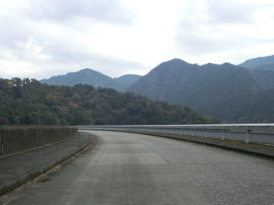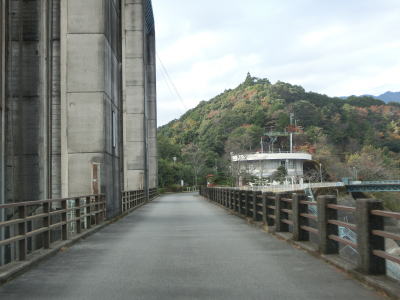 | ウノス橋から約800mで池原ダムの南側を右折してダムの天端を走る。案内標識が設置されていないため事前にルートを確認していないと直進してしまう可能性がある。弧を描くアーチダムの上を走って右岸に移る。ダムの上には何の設備もないため見晴しが良い。ダムの東は元々北山川が流れていた場所だが、洪水吐がダムから離れてるため流路が変わって下北山スポーツ公園という施設になっている。 | ||