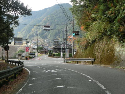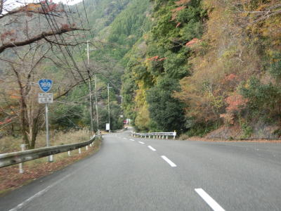 | 池原交差点からはR169だけでなくR309とも重複しながらかつての北山川の右岸を走る。急カーブが多いもののセンターライン付きの2車線道路なのでR425単独区間に比べるとだいぶ走りやすく感じる。法面の工事のため片側交互通行規制が敷かれていたが、設置されていた信号機はよく見られる仮設の可搬タイプではなく電光掲示板に通常と同じものが取り付けられていた。工事は終わりかけていたようなのでこのレポートが公開される頃には撤去されているかもしれない。 | ||