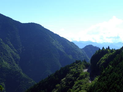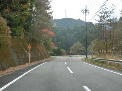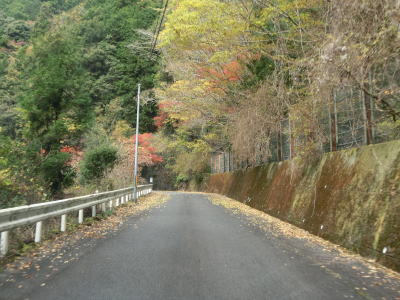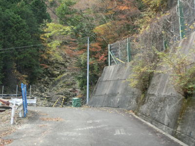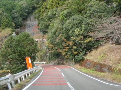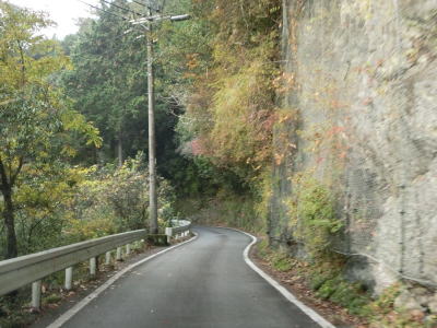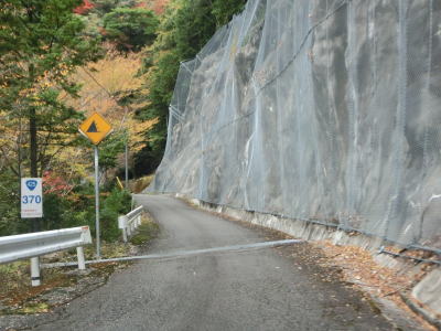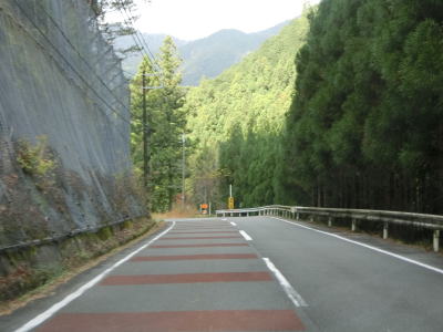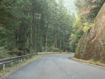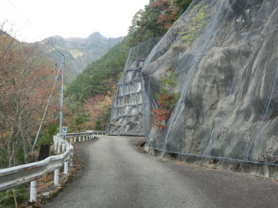 | 酷道区間が始まって3kmほど走ると林道が接続している右のヘアピンカーブを曲がって奥地川から離れる。勾配はさほど変化はなく緩やかなままである。道幅に関しても狭いままである。法面に吹き付けられたモルタルが新しい場所があるが、走行した当時は工事は完了しておらず施行中は時間帯別通行止規制が敷かれていた。モルタル吹付だけでなく落石防止ネットも張られている箇所が多く、落石や崩落が頻繁に起こる場所である事が分かる。 | ||