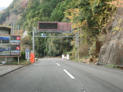 | 酷道区間が始まってすぐに工事現場の出入口に設置されているアルミキャスターゲートの間を通過する。国道の本線にこの手のゲートが設置されているのは初めて見た。通行止の際はこのゲートが閉じられるのだろう。ゲートを越えると早くも道幅が1.0車線にまで狭くなってしまう。その後は多少広くなる箇所もあるがせいぜい1.5車線程度で離合は難しい。 | ||