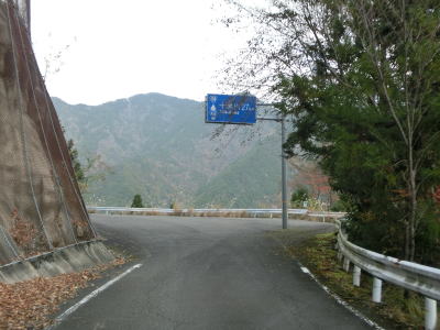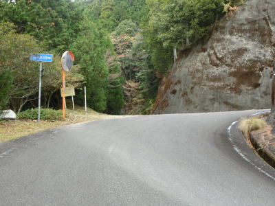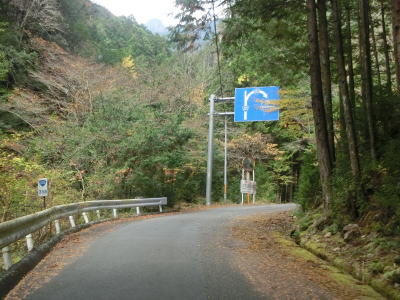 | 四ノ川林道が接続している右ヘアピンカーブを曲がる。カーブの外側に小さな案内標識が設置されているが、林道は未舗装でありこれがなくてもルートミスする事はないだろう。ヘアピンカーブからは見晴らしが良くなるが、道路状況には大きな変化は見られない。 | ||