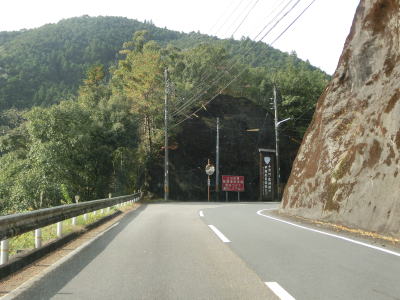| R168ワラビ尾交差点を右折して単独区間になって右ヘアピンカーブを曲がり終えた所でセンターラインがなくなる。交差点からの距離は僅か100m程度である。西川沿いを走っているとセンターラインが復活して奈良r735交差点と新西川トンネルを通過する。r735も奈良・和歌山県境を引牛越という峠で越えており、十津川〜龍神間の往来はR425よりも利用者が多いようである。ただし、谷筋を通る狭路であり決して快適に走れる道路状況ではない。r735の200m弱はR425の旧道であり、村道に降格した西川隧道は現在でも通行可能である。 新西川トンネルを出た直後に昴の湯というホテルを通過して右ヘアピンカーブを曲がる。このヘアピンカーブからが本格的な酷道区間が始まる。十津川・龍神間の改良促進を願う看板の他にドライバーに転落事故が多いと警告している赤色の看板が設置されている。 |