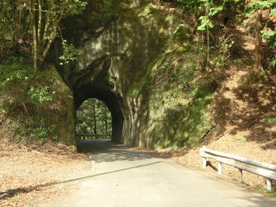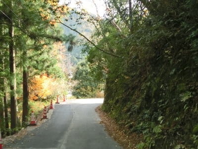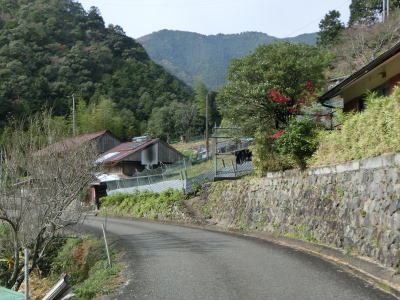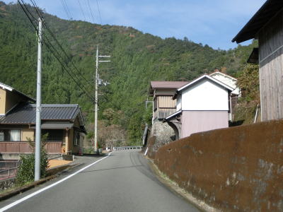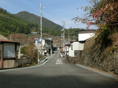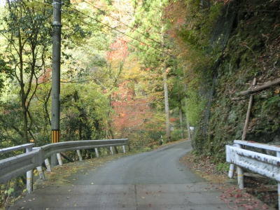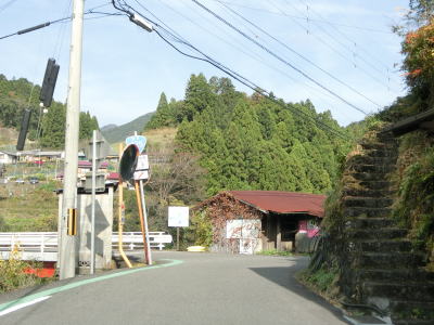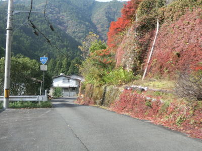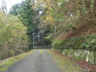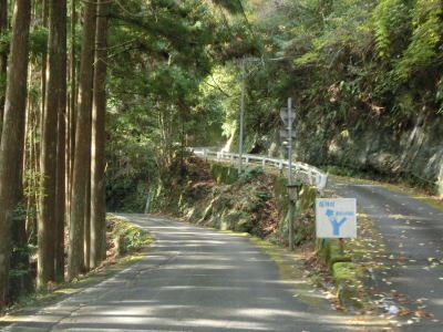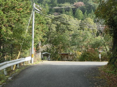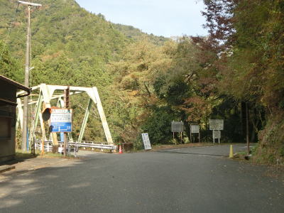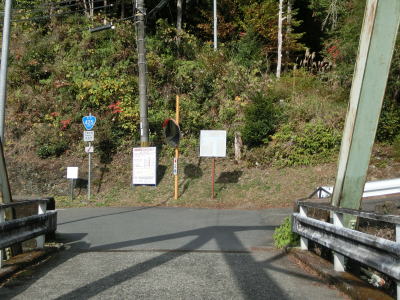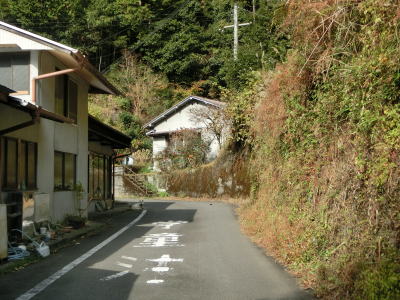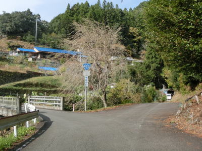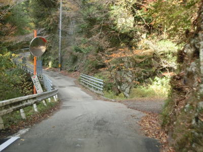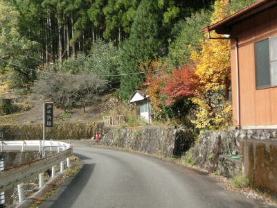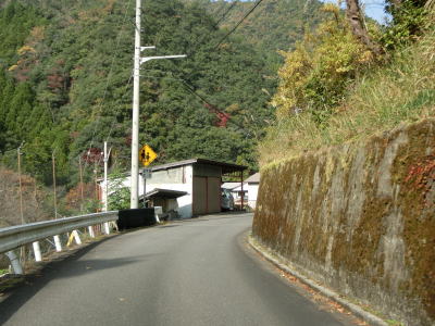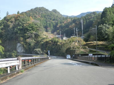 | 熊野古道から逸れたからではなかろうが、大谷橋以降は道路状況が悪くなる。勾配やカーブの多さは変わらないが、道幅が狭い割合が増え、ガードレールの設置率も低くなる。このような道路状況の変化がみられるもののこれより奥にもまだ集落は存在している。廃屋(倉庫?)の脇に対岸に渡る歩行者用の吊り橋が架かっているが、その先の津越集落は既に定住者はなく廃村となっている。 | ||