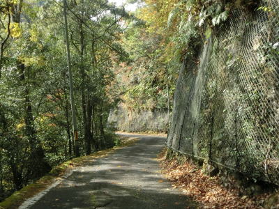 | 公衆トイレを過ぎてしばらく走ると迫西川集落を通り抜ける。これまでの沿線の集落は狭いながらも平らな場所があったが、この集落はまさに斜面にあるため道路の左右の家屋で1階部分の高さが異なる。迫西川集落を過ぎると道路状況は変わらないが、北向きの斜面のため日当たりが悪いようで路面の苔が目立つようになる。 | ||