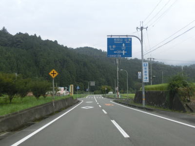 | 播州トンネルを出るすぐに右にカーブしてから旧道との交差点を通過する。市町境=峠のため丹波市に入ってからは下り勾配が続いている。勾配はやや急だが、改良された2車線道路のため走りにくさは全く感じない。大名草集落に差し掛かると勾配は緩やかになり、R429大名草上交差点を通過する。案内標識に表記されていないが、ここからはR429との重複区間である。なお、R429生野方面は案内標識通りの「大型車通行困難」な酷道である。 | ||
