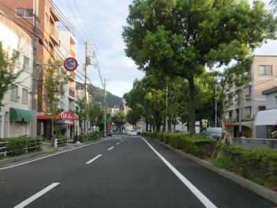 | 有馬道交差点から約1.4km先の市道の山麓線との平野交差点で左側車線が左折専用車線となり、交差点以北は対面の2車線になる。建物が途切れる地点で豪雨時に落石や崖崩れが発生する区間である旨の警告標識が立てられている。天王谷川を渡る手前にセンターラインのないの道路が交差しているが、そちらが旧道である。旧道沿いに家屋があるためバスは旧道を走っているが、大型車両は通行禁止で普通車も時間帯によっては通行できない。 | ||