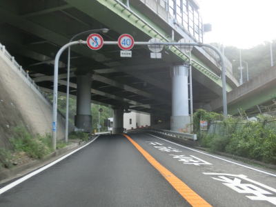 | 反対側車線の登坂車線がなくなってからも下り勾配が続いている。信号機のない旧道との交差点を左にカーブしながら通過し、蓑谷川を2回連続で渡った先で箕谷トンネルをくぐる。 | ||