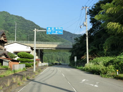 | センターラインがなくなったように見えるが、経年劣化で消えてしまっただけである。やや急な左カーブを曲がって土肥橋を渡って右カーブを曲がる。その後もセンターラインが消えてしまった2車線道路を走る。交通量が非常に少ないため走りやすい。 | ||