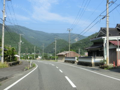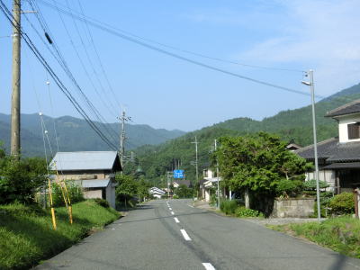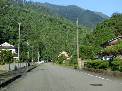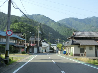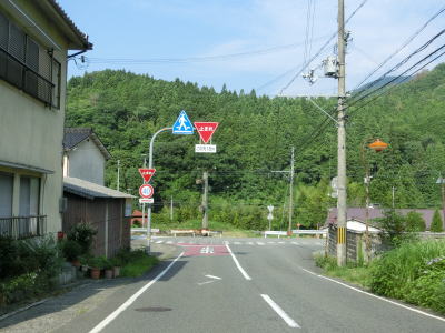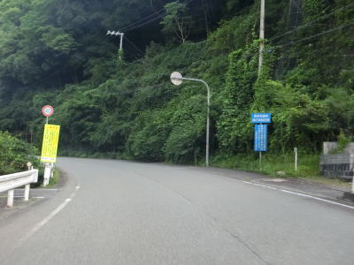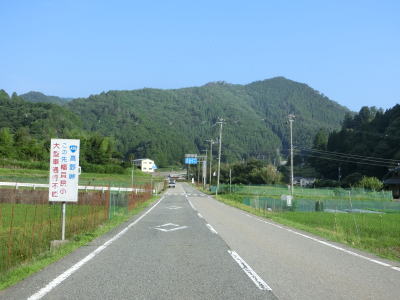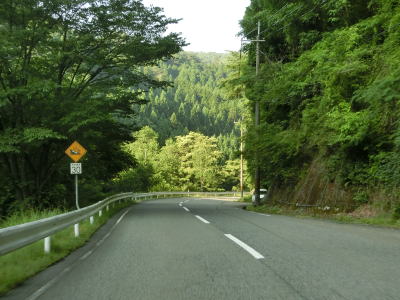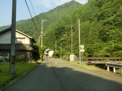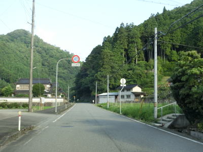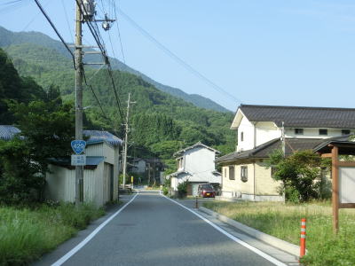 | 最後の2連続ヘアピンカーブを過ぎた直後からセンターラインが復活して2車線道路になる。旧波賀町の最初の集落の水谷集落には異常気象時通行規制区間の終点がある。以降も2車線道路が続いていいるが、水谷川に沿っているせいもあって集落が途切れている箇所はカーブが多い。 | ||