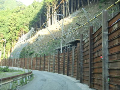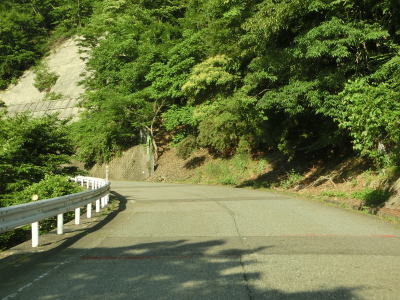 | 1.0〜1.5車線幅の狭路を下り続ける。最初の左ヘアピンカーブ以降は小刻みなカーブは少なくなるが、2連続ヘアピンカーブが3ヶ所ある。旧波賀町側にも法面を補修した箇所が確認できるが、これも西日本豪雨で崩れた場所かもしれない。 | ||