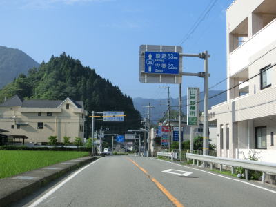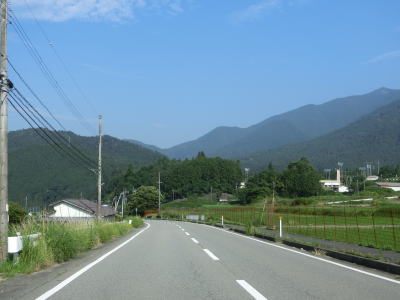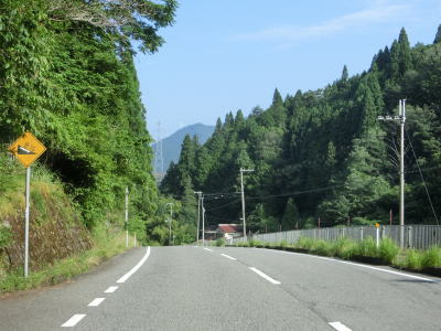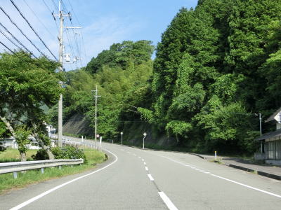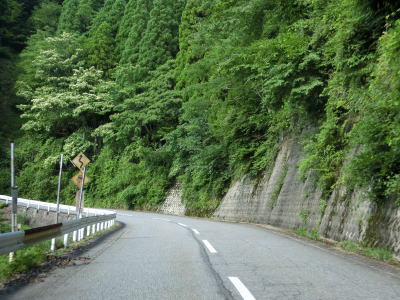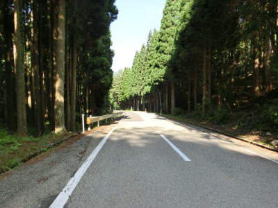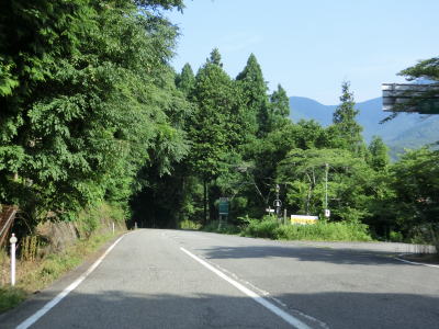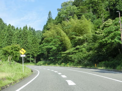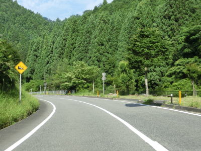| 後山川の流域の2車線道路を快走する。勾配はごく緩やかな下り勾配でカーブは多いものの緩やかなものがほとんどである。センターラインがなくなる箇所があるが、延長は50mに満たず極端に狭くなる訳ではないので難なく通過できる。 | ||