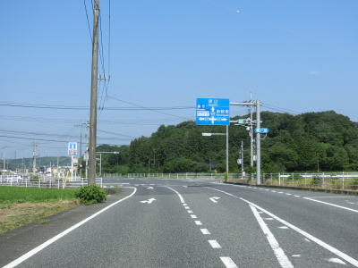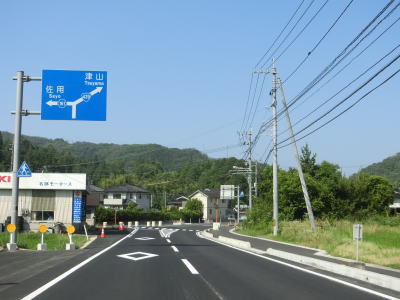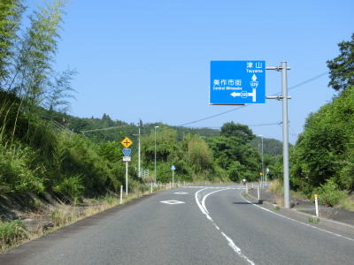 | 津山広域農道との短い重複区間を過ぎてからも走りやすい2車線道路が続いている。前述したとおり、岡山県津山市〜京都府福知山市間は1993年に延伸追加された区間だが、岡山県内はほぼ整備が済んでおり快走路区間が殆どである。そんな快走路を走っていると岡山r67との交差点を通過する。 | ||