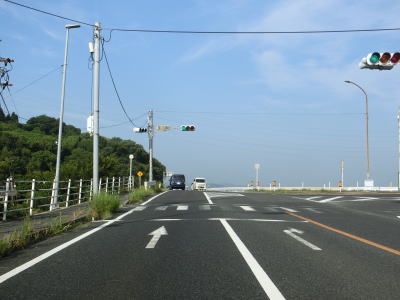 | 430.左前方に見えているのは岡山r398水島大橋 | 431.狐島三差路交差点 | 432.狐島三差路交差点以西は平坦な直線道路 |