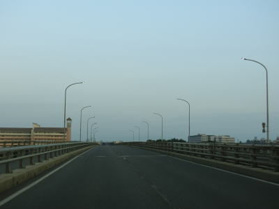 | 平坦な直線道路を走っていると緩やかな上り勾配が始まり、皆生大橋で日野川を渡ると再び米子市に入る。日吉津村は面積の小さな村で、日本海に面した北を除いて東西南は米子市と接している。皆生大橋を渡り切った直後に鳥取r300との交差点を通過して緩やかな勾配を下った先で鳥取r206・r300労災病院入口交差点を通過する。 | ||