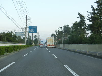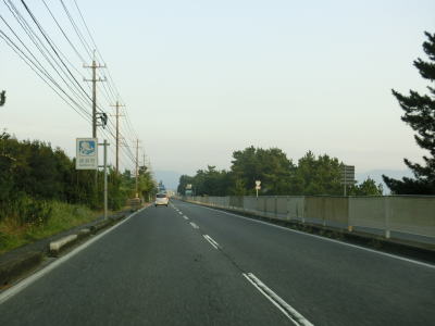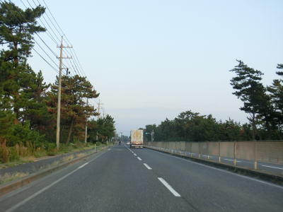 | 米子ゴルフ場に隣接している弓ヶ浜公園を通り過ぎて少し走ると鳥取r317河崎交差点を通過する。r317も片側2車線道路であり、道なりに走ると米子市の中心部でR9と交差している。河崎交差点の直後に右カーブを曲がり、その後緩やかな左カーブを曲がってからは弓ヶ浜沿いを走る。浜辺のすぐ傍を通っているが、標高差が小さく防風林もあるため海はほとんど見えない。 | ||
