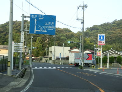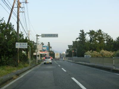 | 島根r2交差点からは境水道の北岸を走る。境水道は中海が淡水化されて汽水湖となったため斐伊川の一部、つまり河川である。対岸は先ほどまで走っていた境港市の市街地が広がっている。右の急カーブを曲がった直後にR485との交差点を通過する。R485は隠岐諸島と松江市を結んでおり、2つの海上区間を持つ。R485にフェリーのりばが案内されており、七類港が海上区間の本土側の港である。 | ||