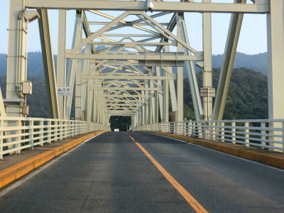 | 料金所跡を過ぎると7%の急勾配を上って境水道大橋を渡って島根県松江市に入る。県の境標識は橋の中央付近に設置されているが、市の境標識は松江市が北詰、境港市が南詰に設置されている。有料道路の頃から歩行者や自転車も通行できたが、歩道が極端に狭いため徒歩はともかく自転車で走行するのは難しい。 | ||