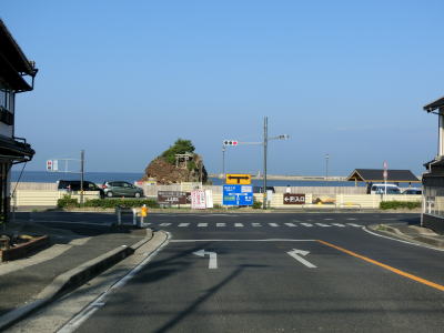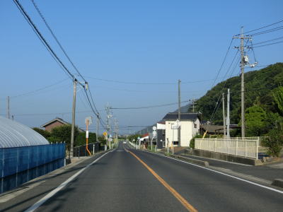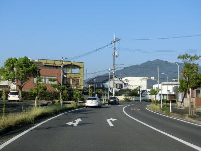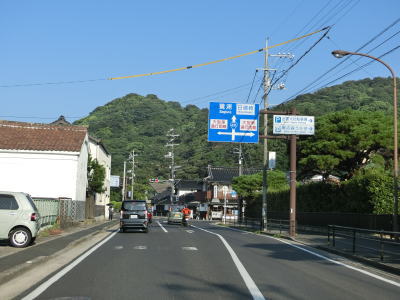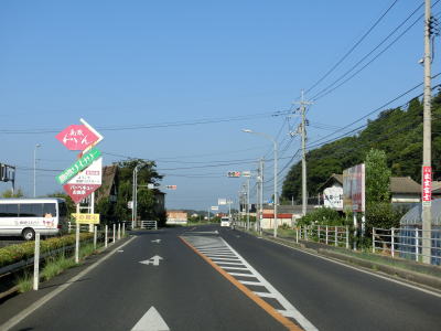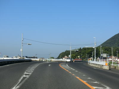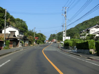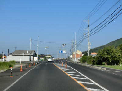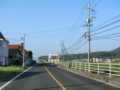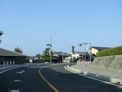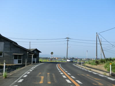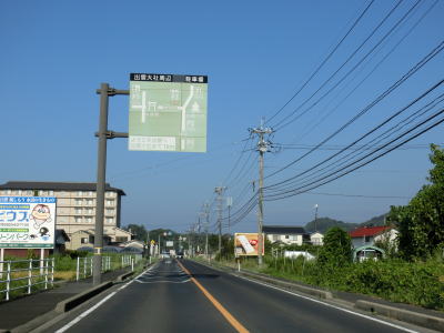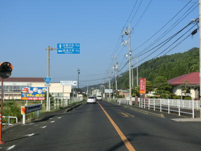 | 灘橋の南のカーブからは海岸線を離れて内陸部へと進んで桃山トンネルをくぐる。島根r29交差点から約2.9kmで市道との万代橋東交差点を右折する。その直前の信号機のない交差点が旧道との交差点である。現在はバイパスから右折なし左折なりしなければならないがかつては道なりに進んで旧大社町の中心部の狭路を通らなければならなかった。 | ||
