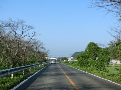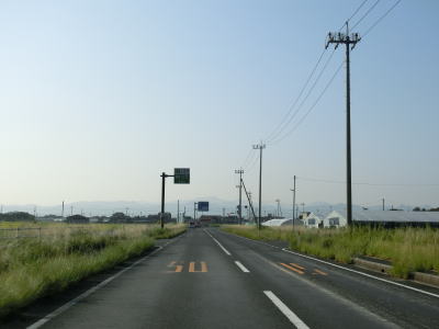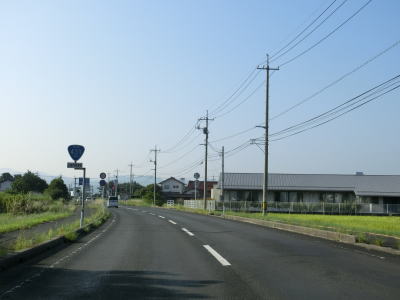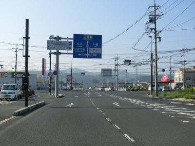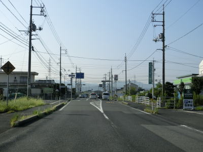 | バイパス合流後も道路状況変わらず、対面2車線道路が続く。歩道は設置されているものの東向き車線側のみである。山裾のほぼ平坦かつ直線基調の2車線道路を走っていると島根r276遥堪交差点、次いで島根r28菱根交差点を通過する。北には山があるため、2つの県道はどちらも南にのみ延びている。 | ||